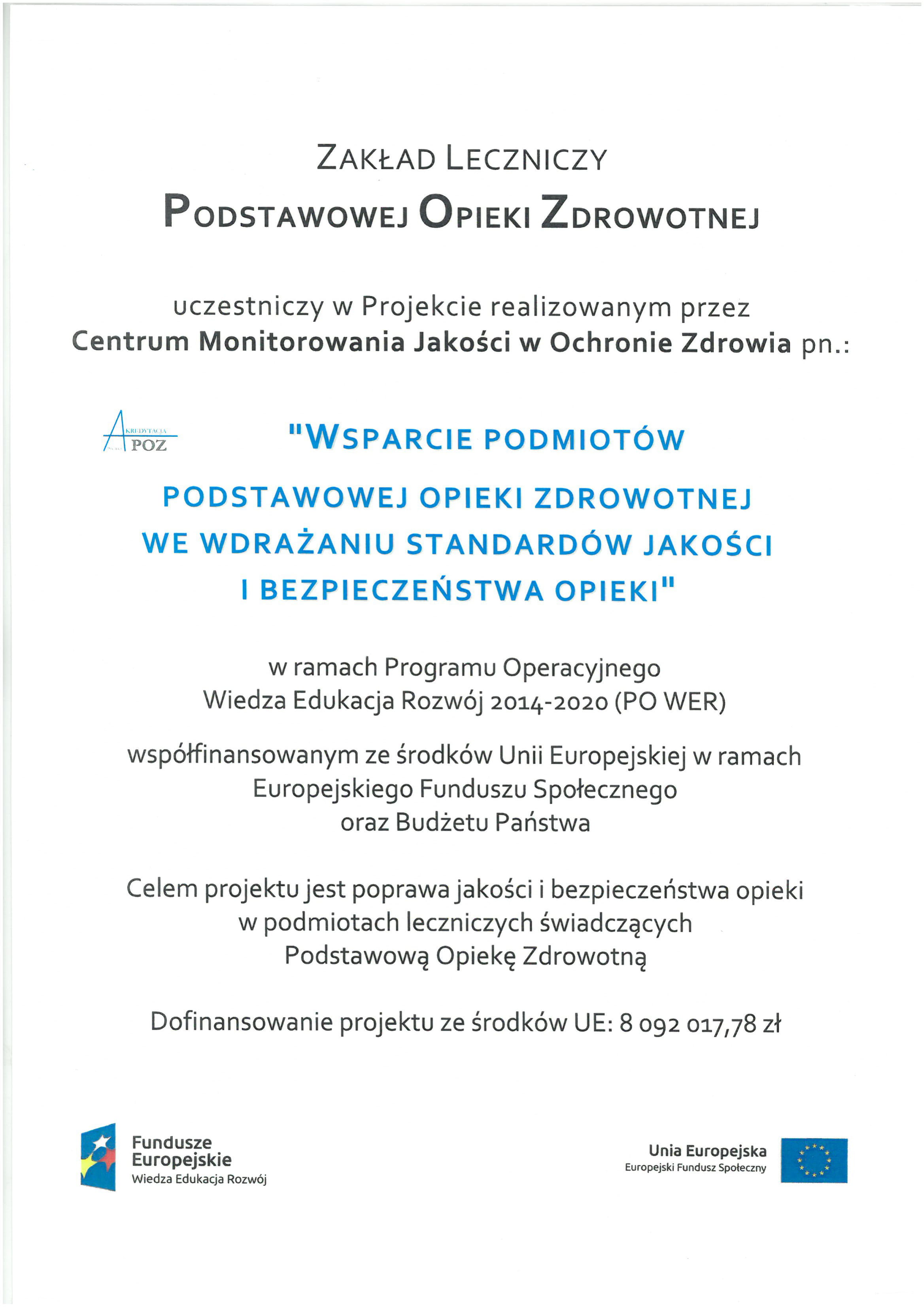 Celem projektu jest poprawa jakości i bezpieczeństwa opieki w podmiotach leczniczych świadczących Podstawową Opiekę Zdrowotną